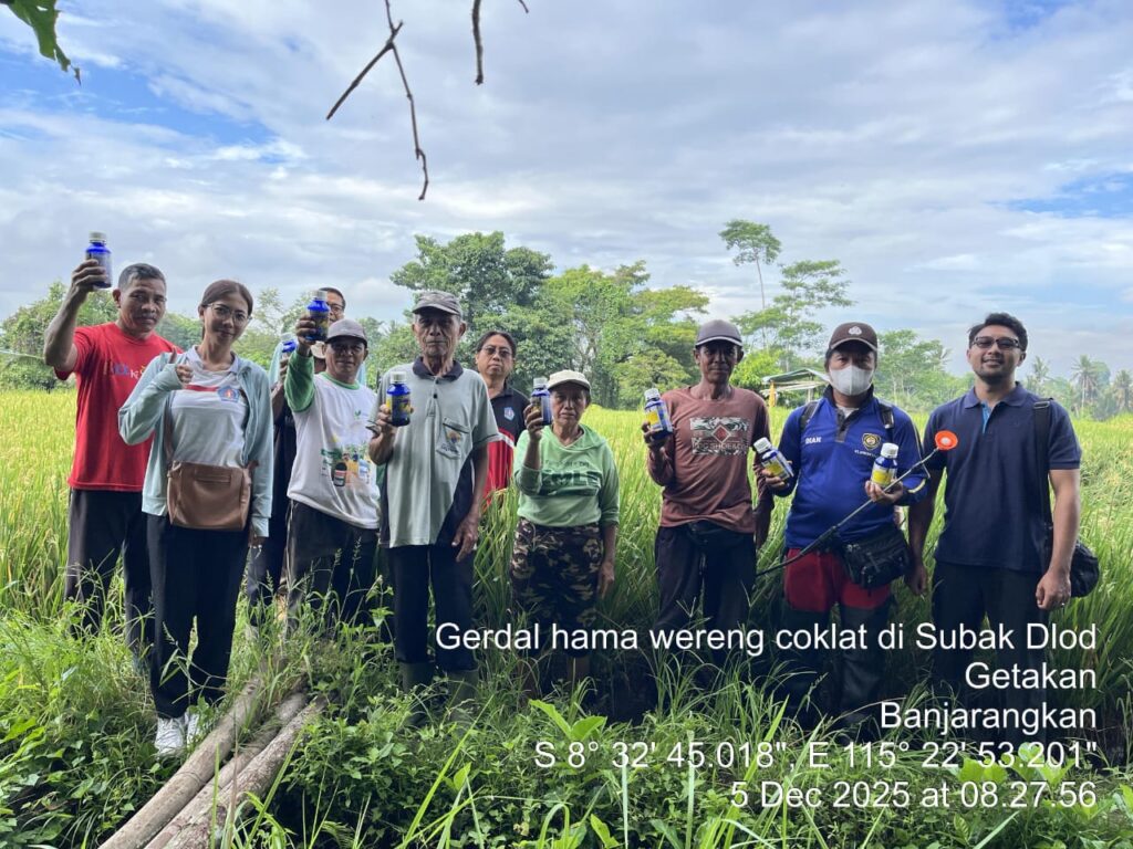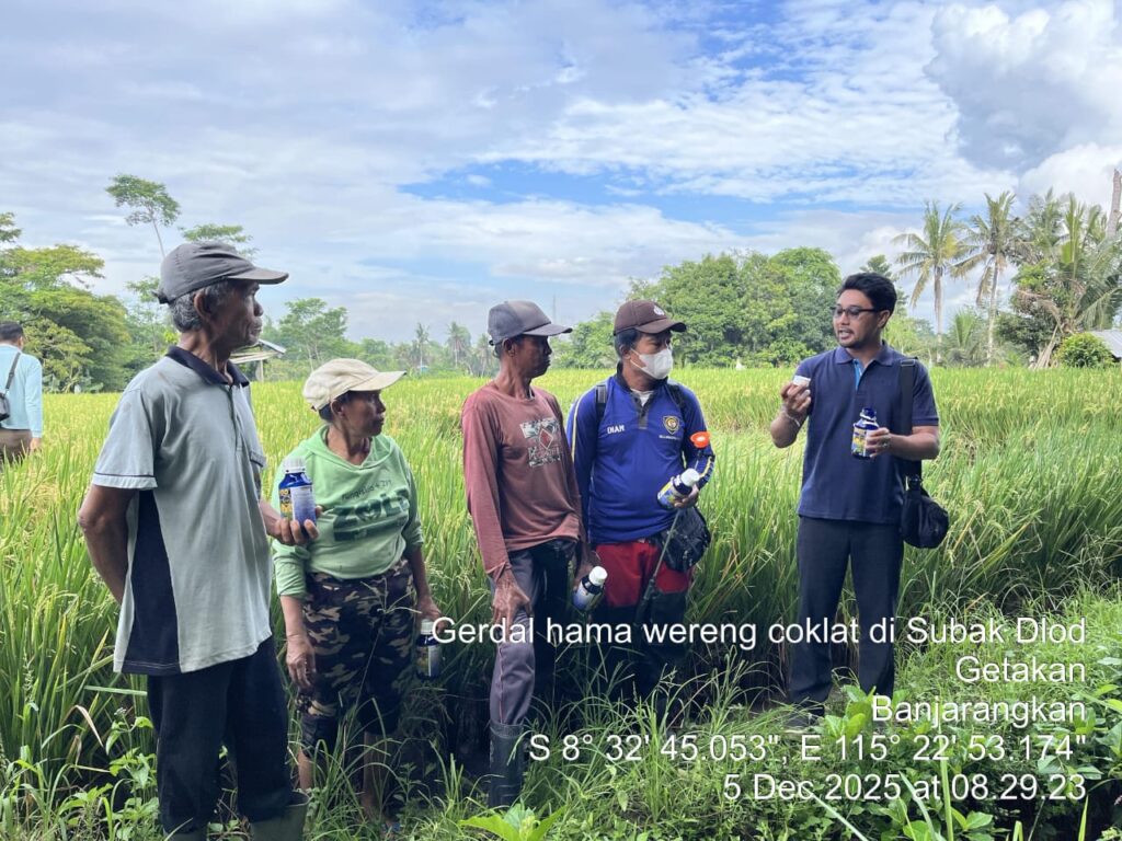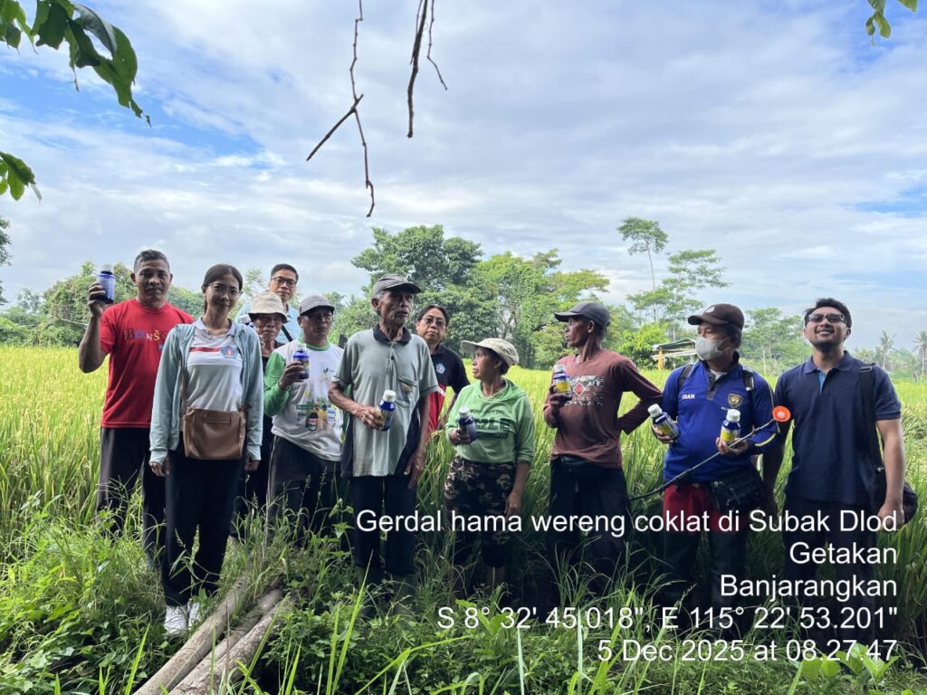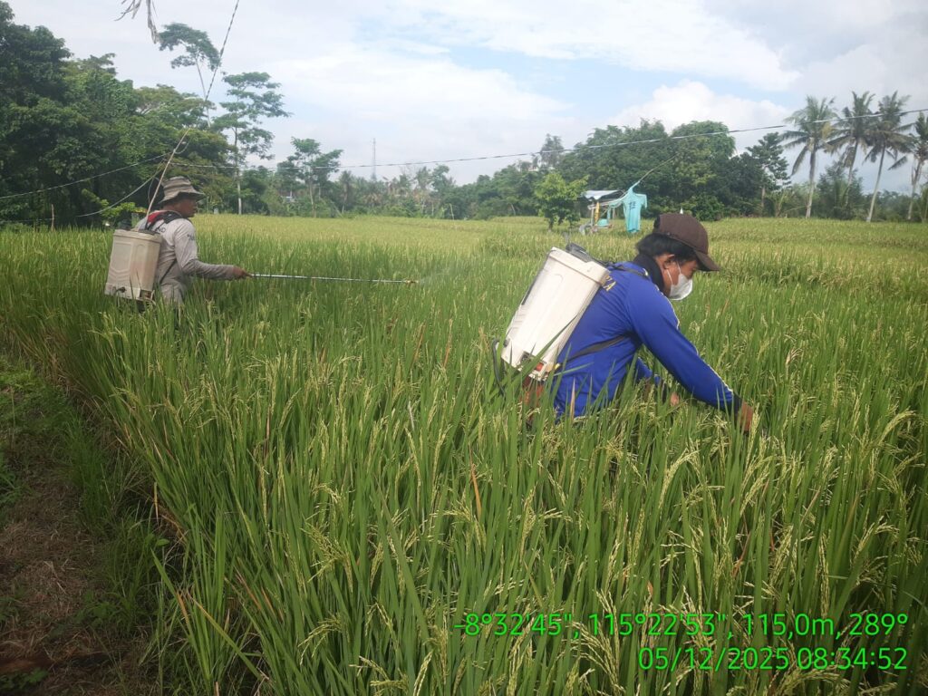 Banjarangkan, 5 Desember 2025 ~ Telah dilaksanakan kegiatan Gerakan Pengendalian Organisme Pengganggu Tumbuhan (OPT) di Subak Dlod Getakan, Desa Getakan, Kecamatan Banjarangkan, Kabupaten Klungkung, Provinsi Bali. Kegiatan ini dilakukan pada tanaman padi sawah varietas Inpari 32 yang berumur ±80 HST.