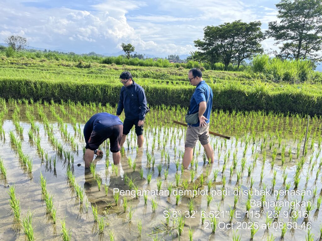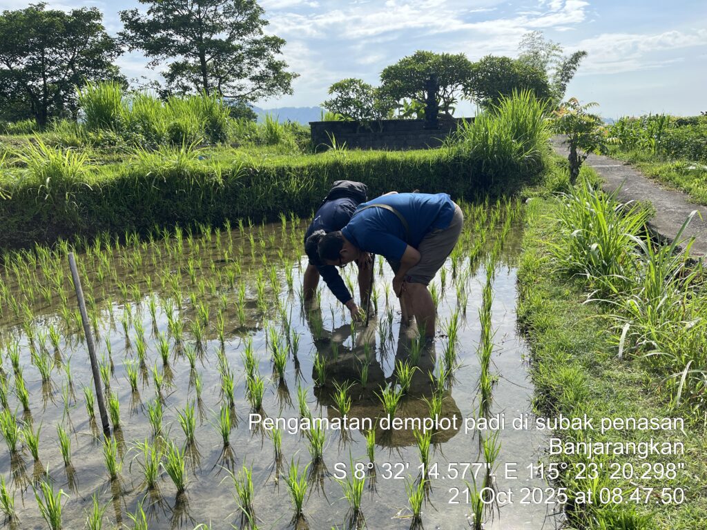 Banjarangkan, 21 Oktober 2025 ~ PPL Subak Penasan, POPT Kec. Banjarangkan, dan pemilik lahan percontohan Bapak Komang Artana melakukan pengamatan demplot padi umur 15 HST di lahan seluas 29 are yang berlokasi di Subak Penasan. Demplot ini menggunakan pupuk produksi Pupuk Indonesia, yaitu NPK+, ZA, dan Phosgreen.