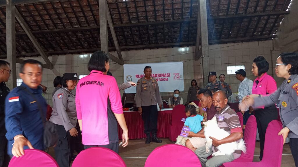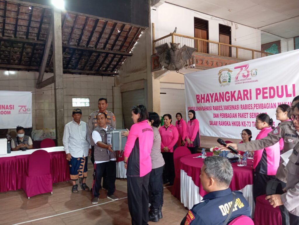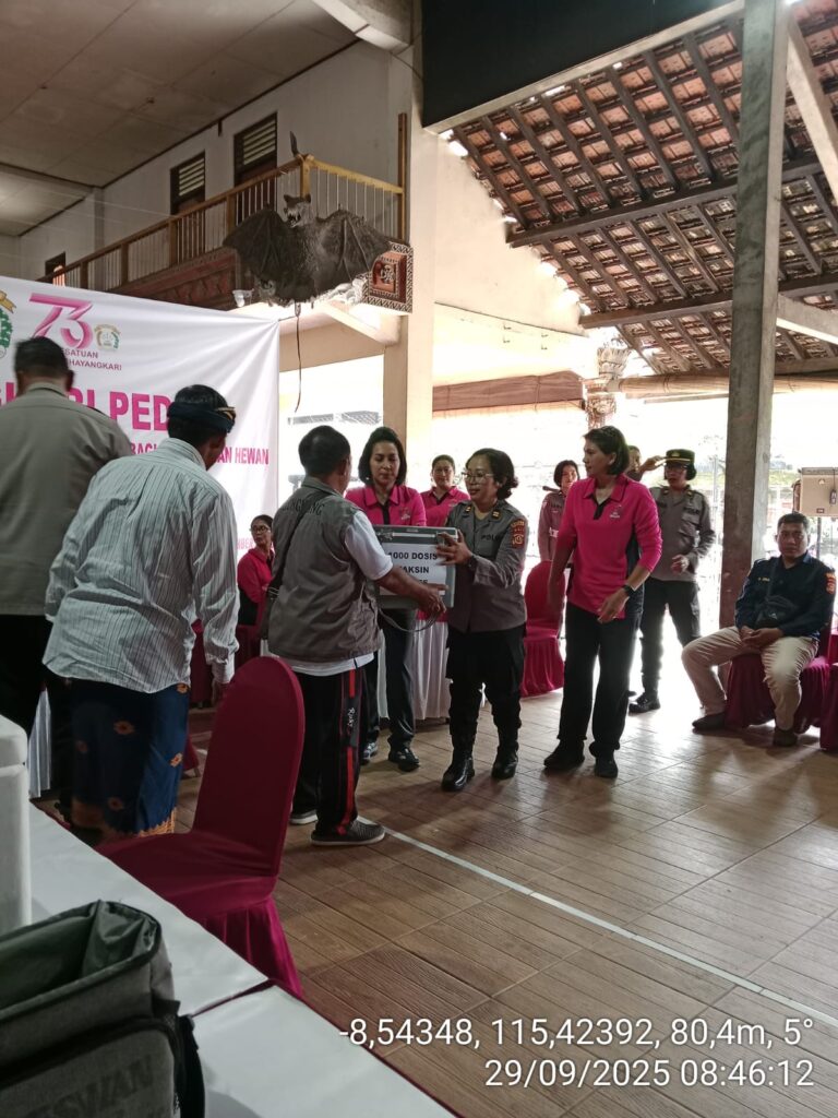 Dawan, 29 September 2025 – Dalam rangka memperingati Hari Kesatuan Gerak Bhayangkari (HKGB) ke-73 Tahun 2025, Bhayangkari Klungkung Bersama Dinas Pertanian Kabupaten Klungkung menggelar kegiatan sosial bertajuk “Bhayangkari Peduli” yang berfokus pada pencegahan penyakit Rabies dan peningkatan kesejahteraan masyarakat. Bertempat di Balai Desa Gunaksa kegiatan ini dilaksanakan bersinergi dengan Dinas Pertanian Kabupaten Klungkung. Aksi ini bertujuan agar masyarakat lebih waspada terkait bahaya rabies dan mengurangi resiko terjangkitnya rabies pada hewan peliharaan. Rabies adalah penyakit zoonosis yang sangat mematikan. Adapun Kegiatan inti terkait pencegahan Rabies meliputi: